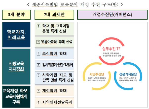 그러나, 세종시법은 총 30개 조문에서 재정, 조직, 조례 운영과 같이 여러 특례를 담고 있지만 재정특례를 제외하고는 교육에 관한 특례사항은 전무한 상황이다.