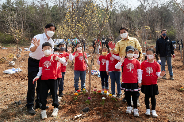 이날 행사는 오세현 아산시장을 비롯한 관대초등학교 학생, 둔포면기관장협의회, 아산테크노밸리 입주기업체협의회 등 약 100여 명이 참석한 가운데 산수유와 왕벚나무 150그루를 심고 심은 사람의 이름과 소망글을 적어 표찰을 달았다.