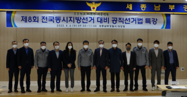 [충청뉴스 최형순 기자] 세종경찰청(청장 윤명성)은 6일 세종남부경찰서 대강당에서 제8회 전국동시지방선거가 임박함에 따라 선거사범 수사역량 강화 및 공직선거법 위반을 미연에 방지하고자 세종청 및 세종남․북부서 경찰관을 대상으로 공직선거법 특강을 했다.