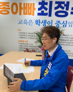 최정수 예비후보는 갈색곱슬머리에 안경을 쓰고 검정색 양복을 입은 캐릭터로 꾸며 가상교실 안에서 참여자들을 맞이하고, 1시간여 교육을 주제로 참여자들의 질문과 고민상담에 대한 답변을 이어갔다.