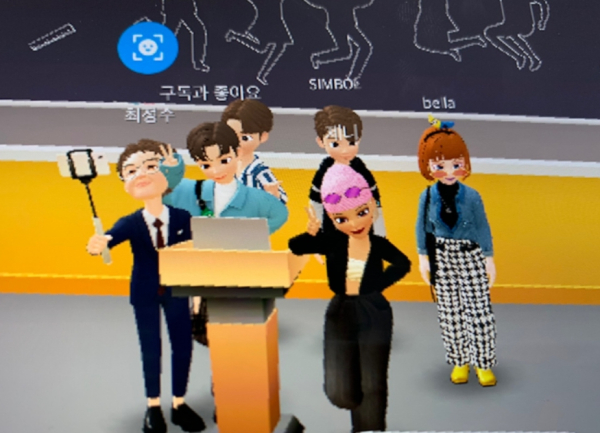 메타버스 간담회 중간에 아바타가 춤을 추기도 하고, 교실 문 안팎을 왔다갔다하는 참여자 캐릭터들이 있어서 실제 수업시간 인 듯 “자리에 앉아 주세요”,“거기 학생, 수업시간에 춤을 추면 안되죠” 등의 이야기가 오가며 아이스브레이크 역할을 했다. 마지막으로 참여자들이 함께 기념사진 촬영을 하고 간담회를 마쳤다.