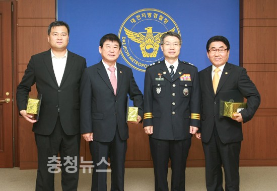 대전시의회 임재인·최진동 의원, 유성구의회 송대윤 부의장 감사패 받아 대전시의회 임재인·최진동 의원 및 유성구의회 송대윤 부의장은 1일 대전지방경찰청으로부터 시민치안 소외지역 해소 등의 공로를 인정받아 감사패를 수여받았다. ▲ 왼쪽부터 송대윤 유성구의회 부의장, 최진동 대전시의원, 김학배 대전경찰청장, 임재인 대전시의원. 이날 감사패는 지난 2010년 9월 대전시의회 제190회 제1차 정례회에서 시민치안 소외지역 해소를 위해 ‘유성경찰서 신설’건의문을 채택해 정부 예산편성에 기여하고, 지난 7월 제196회 1차 정례회에서 ‘대전경찰인력증원 촉구’ 건의문을 대표발의해 중앙정부와 국회 등 15개 기관에 제출하는 등 공로를 인정 받아 수여됐다. 저작권자 © 충청뉴스 무단전재 및 재배포 금지 이재용 기자 다른기사 보기 기사가 마음에 드셨나요? 충청뉴스 좋은 기사 후원하기 1,000원 3,000원 5,000원 10,000원 30,000원 50,000원 직접입력 비회원 약관동의하기 ※ 소중한 후원금은 더 좋은 기사를 만드는데 쓰겠습니다.