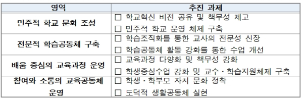 이를 실현하기 위해 교육청은 학교 구성원들의 소통과 공감을 통한 민주적 의사결정 과정을 지원하는 ‘학교혁신문화지원단’을 조직해 ‘학교로 찾아가는 워크숍’을 운영하고 있다.