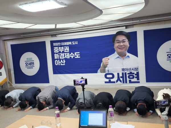 이날 기자회견에는 민주당 아산시 현역 시·도의원들과 예비후보들이 총출동해, ‘민주당 원팀’ 선거전을 치르겠다는 의미로 다 함께 큰절을 하며 각오를 내보였다.