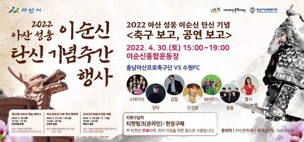 ‘축구 보고, 공연 보고’는 아산프로축구단과 수원FC의 친선교류경기를 관람하고, 이어지는 초청가수 스테이씨, 영탁, 민경훈, 홍시, 김필과 지역 밴드인 바비핀스, 몽돌의 공연으로 시민과 함께하는 문화행사를 즐길 수 있다.