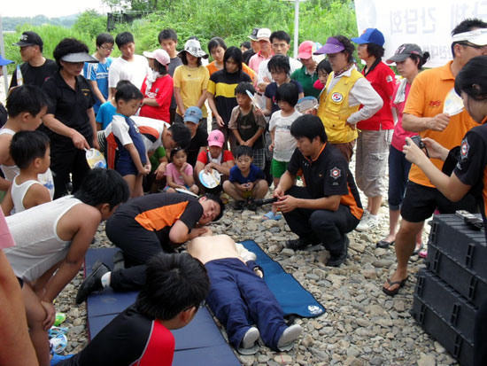 체험행사 후 참석자들은 ‘안전한 물놀이 구명조끼 착용으로부터’라는 어깨띠를 착용하고 물놀이 안전사고 예방법과익수자 구조 및 심폐소생술 등을 담은 리플릿 500부와 홍보용품 300개를 주변 피서객에게 나눠주며 대상으로 물놀이 안전 홍보 캠페인을 벌였다.