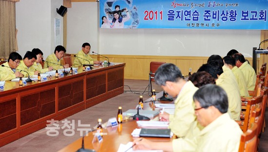 대전 중구는 10일 오는 16일부터 실시되는 ‘2011 을지연습‘에 대비해 박용갑 중구청장을 비롯한 과장급 이상 간부가 참여한 가운데 중회의실에서 ’을지연습 준비상황보고회‘를 개최했다.