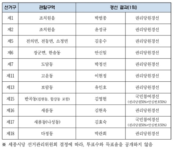 [충청뉴스 최형순 기자] 더불어민주당 세종시당은 4일 세종시의원 11개 지역구 경선결과를 발표했다.