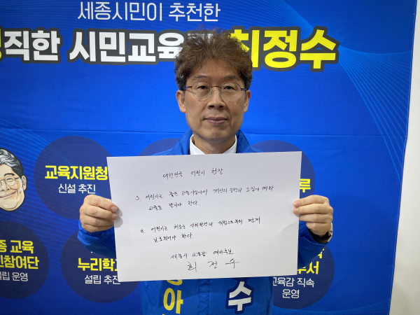 [충청뉴스 최형순 기자] 올해는 어린이날이 100주년이 되는 해이다. 코로나 여파로 세종시 각 기관별 소규모로 어린이의 날 기념 행사와 이벤트가 진행되는 가운데, 세종시 교육감 최정수 예비후보는 ‘대한민국 어린이 헌장’ 쓰기 릴레이에 참여했다.