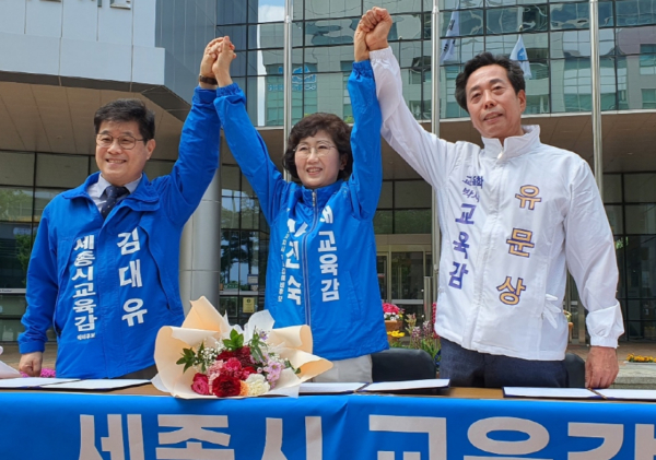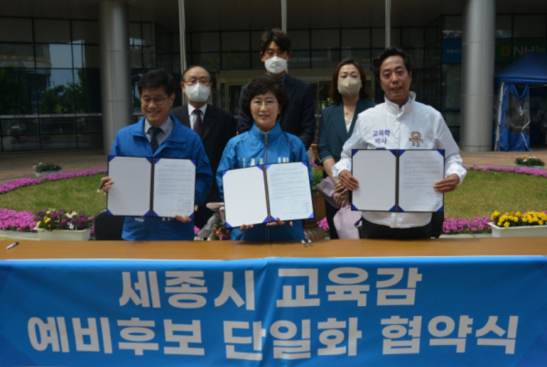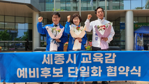 [충청뉴스 최형순 기자] 세종시교육감 예비후보 김대유,사진숙,유문상(가나다순) 후보가 6일 세종시교육청 앞에서 단일화 기자회견과 협약식을 가졌다.