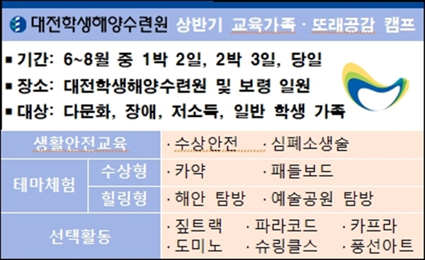 [충청뉴스 이성현 기자] 대전학생해양수련원은 6월 7일부터 8월 20일까지 대전 관내 초·중·고교 가족 및 학생 등을 대상으로 상반기 ‘교육가족·또래공감 캠프’에 대한 모집을 실시한다고 9일 밝혔다.