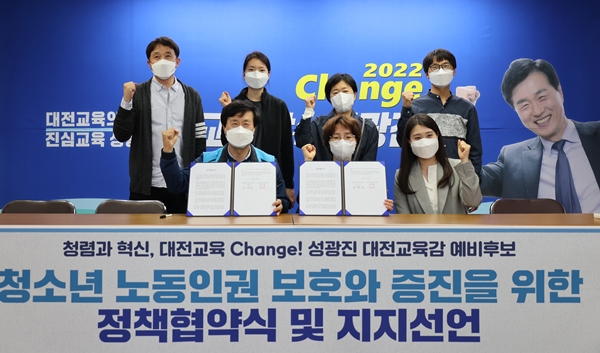 특히 ▲대전시, 교육청, 고용노동청, 청소년 노동인권단체 등과 함께 민관 협력기구 구성 ▲노동인권 담당교사 배치로 학생 아르바이트 및 현장실습 상담과 구제 활동 지원 ▲청소년 노동인권 실태조사 ▲교육청 내 노동인권 담당관을 설치 등을 공약했다.