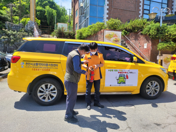 천안서북소방서는 천안시교통약자 지원센터와 협업해 교통약자 이동지원차량 운전자의 책임감 향상을 위한 화재 초기 대응요령을 교육했으며, 한화솔루션 갤러리아 부문&한화에스테이트 운영지원센터의 사회환원사업으로 교통약자 이동지원차량에 소화기 80대를 후원했다.