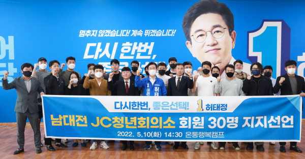 남대전청년회의소 김주호 회장은 지지선언문에서 “허태정 후보는 민선7기 시장으로 재임하는 중 단 한차례도 부정을 저지르지 않았고 성실히 시장직을 수행했다”며 “특히 치적 쌓기와 겉으로 드러나는 보여주기식 행정을 멀리하고 시민의 실생활에 관련된 실효성 있는 정책으로 대전시를 안정적으로 이끈 인물이기에 민선8기 연임시장으로서 큰 역할을 다하기를 바란다”며 지지 배경을 설명했다.