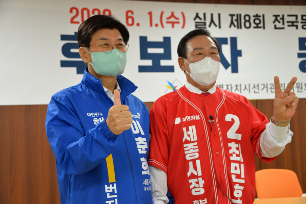 [충청뉴스 최형순 기자] 12일 제8회 전국동시지방선거 후보등록 첫날 세종시장에 출마한 이춘희 현 시장(더불어민주당)과 최민호 전 국무총리 비서실장(국민의힘)이 나란히 후보등록을 마쳤다.