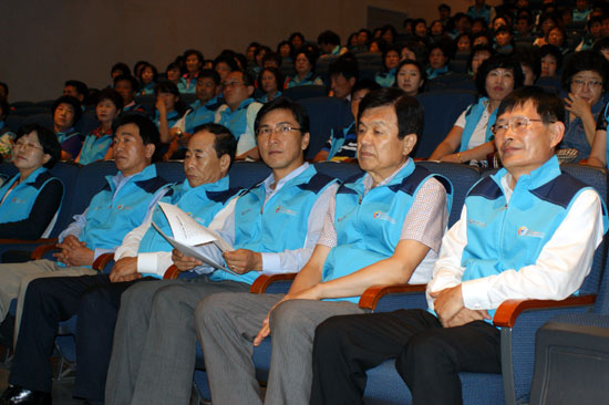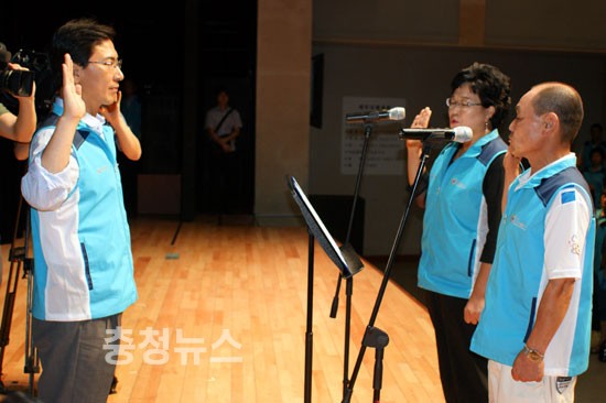 오후3시부터 진행된 자원봉사자 교육이 끝난 후 발대식을 위해 안희정 충남도지사, 유병기 충남도의회 의장, 권오룡 엑스포조직위원장, 박동철 금산군수, 한찬희 조직위 사무총장 등 내빈이 등장하자 자원봉사자들은 뜨거운 박수를 보냈다.