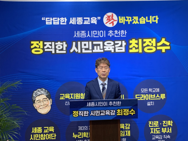 지난주 최종 후보등록을 마치고 본격적인 선거전에 돌입한 가운데 2월부터 꾸준히 선거활동을 해온 최정수 세종시 교육감 후보는 '7번째 월요공약발표회'를 열고 평생교육 정책공약을 발표했다.