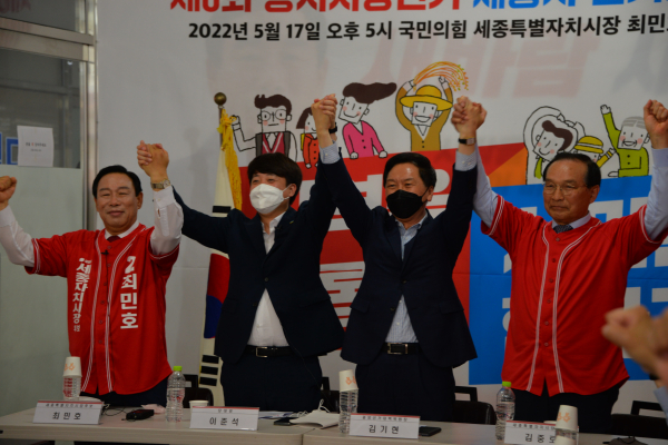 최민호 세종시장 후보는 "윤석열 대통령께서 ▲대전.세종경제자유구역 지정 ▲글로벌 청년 창업 빌리지 조성 ▲세종디지털 미디어센터 건립 ▲국립 중입자 가속기 암치료선터 설립 ▲대통령 세종 제2집무실과 국회의사당 건립 ▲대학 세종 공동캠퍼스 조기 개원 ▲충청권광역 철도망 구축 공약을 7개를 하셨는데 그것이 한결같이 세종시민들의 폐부를 찌르는, 급소를 겨냥하는 그런 공약을 말씀해 주셨다. 마치 행정수도나 국회 이전은 국민의힘이 반대한 걸로 인식되는 프레임에 우리가 얼마나 괴로워했는가"라고 지적했다.