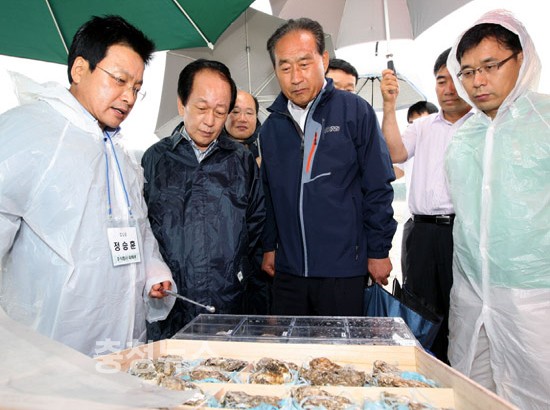 이후 태안의 갯벌참굴 생산어장을 방문해 양식장을 시찰하고 유류피해어장 복원현황도 점검하면서 갓 잡은 참굴과 가공한 해삼을 시식하기도 했다.