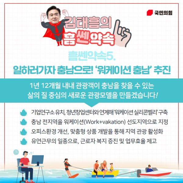 김태흠 후보는 “코로나19 펜데믹으로 인해 젊은 층을 중심으로 워라벨이 보장된 ICT 기반의 비대면 업무 형태로 전환되고 있다”며 “1년 12개월 내내 관광객이 충남을 찾을 수 있는 삶의 질 중심의 새로운 관광모델을 만들겠다”고 밝혔다.