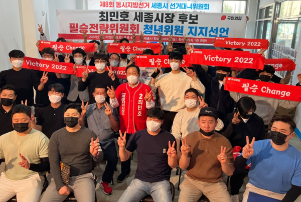 [충청뉴스 최형순 기자] 최민호 국민의힘 세종시장 후보는 22일 선거사무실에서 청년 50여 명이 참석한 가운데 국민의힘 세종시당 필승전략위원회 이진희 청년위원장 진행으로 지지선언을 개최했다.