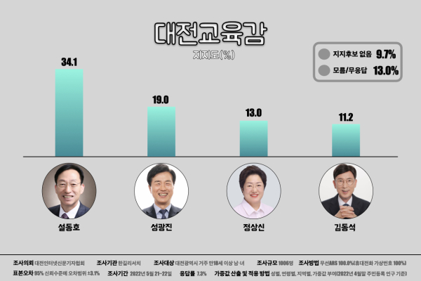 한편 이번 조사는 충청뉴스를 비롯해 굿모닝충청, 디트뉴스24, 대전뉴스 등 대전인터넷신문기자협회가 한길리서치에 공동의뢰해 2022년 5월 21일~22일 대전시 거주 18세 이상 남녀 1006명을 대상으로 진행됐다.