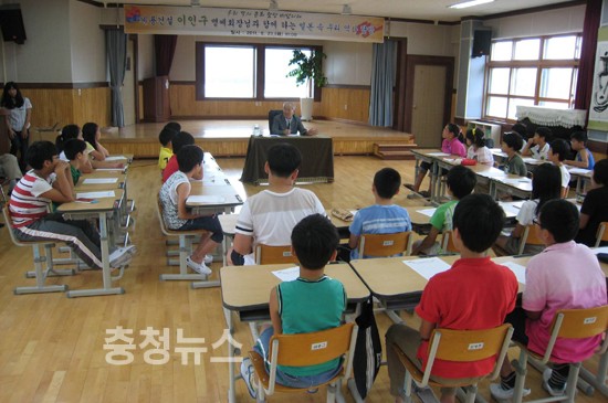 ▲ 이인구 명예회장이 동명초교 학생들을 대상으로 특강을 실시했다.