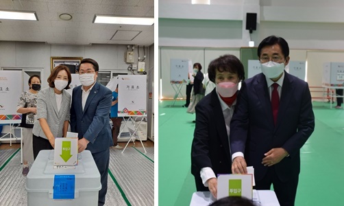 국민의힘 박경귀 아산시장 후보도 이날 오전 9시 배방읍 스포츠센터에 마련된 사전투표소에서 부인과 함께 소중한 한 표를 행사했다.