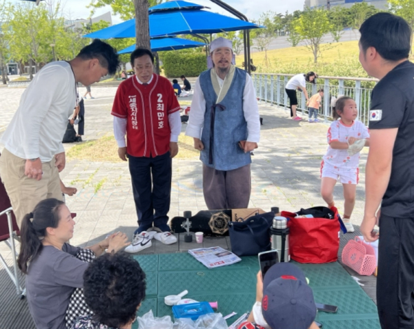 김봉곤 훈장은 29일 오전 11시 30분부터 조치원 시장 과 호수공원에서 시민들에게 최 후보 지지 호소와 함께 기념촬영을 하면서 득표활동을 벌였다.