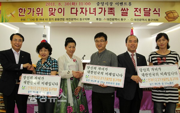 한자녀 더 갖기 운동 연합 동구지부는 30일 동구청 이벤트홀에서 한가위 명절을 맞이해 저소득 다자녀 가정에 쌀 전달식을 개최했다.