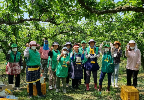 이날 참여자들은 병해충을 방지하고 농약피해를 줄이는 배 봉지 씌우기 작업을 진행, 이를 통해 농촌인력 부족을 해소하고 고품질의 배를 생산하는데 기여할 것으로 기대된다.