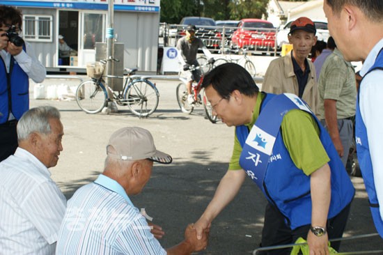 ▲ 자원봉사에 나선 권선택의원을 알아본 시민이 악수를 청했다.