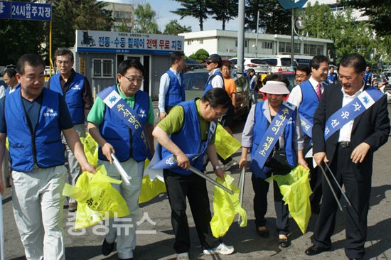 ▲ 권선택의원, 이상태 대전시의회 의장을 비롯한 선진당 당원들이 쓰레기를 줍고있다.