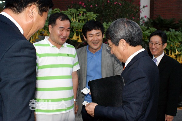 ▲ 정운찬 前 총리와 김거수 충청뉴스 대표가 인사를 나누고 있다.