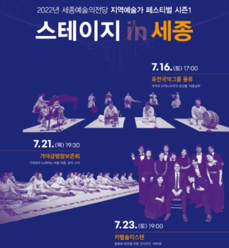 먼저 첫 번째 공연은 7월 16일 토요일 국악과 오케스트라의 앙상블 ‘세종실락(世宗實樂)’으로 국악의 대중화, 세계화를 위해 다양한 시도를 하고 있는 퓨전국악그룹 풍류와 세종시교향악단이 함께 국악의 깊은 정서와 신명, 오케스트라의 화려하고 우아한 소리를 선보일 예정이다.