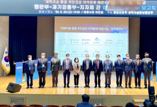 이에 시는 지난 24일 시청 대강당에서 열린 ‘2022년도 과학기술 활용 주민공감지역 문제해결사업 협약식’에서 과제 수행 지자체, 연구기관 관계자 등이 참석한 가운데 행안부, 과기부와 협약을 체결했다.