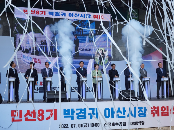 신정호 야외음악당에서 열린 이날 취임식에는 이명수 국회의원, 김희영 아산시의회 의장 등을 비롯한 지역 내 인사들과 많은 시민들이 참석해 아산시 민선 8기의 시작을 축하했다.