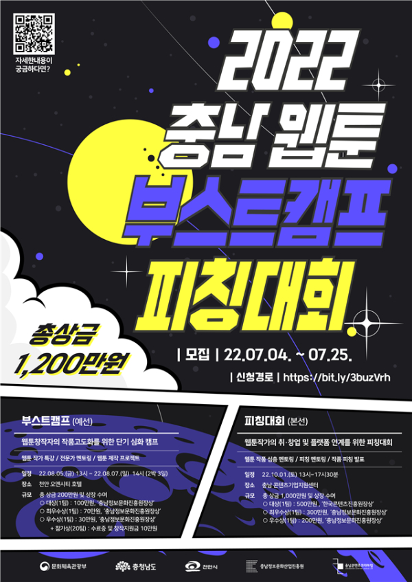 [충청뉴스 박동혁 기자] 충남정보문화산업진흥원(이하 진흥원)이 오는 25일까지 총 상금 1,200만 원 규모의 웹툰 부스트 캠프&피칭대회 참가자를 모집한다.