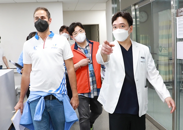 국제대학스포츠연맹 기술점검 실사단(왼쪽)이 세종충남대병원에서 하계세계대학경기대회 개최 도시 선정을 위한 현장 실사를 진행하고 있다.