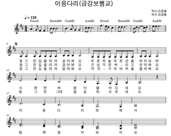 특히, ‘이응다리’ 노래 작곡은 금강의 관광콘텐츠화를 위해 세종시가 구상 중인 ‘비단강 금빛 프로젝트’와도 연계해 문화예술을 통해 금강보행교에 활력을 불어넣으려는 시도라는 점에서 의미가 있다.