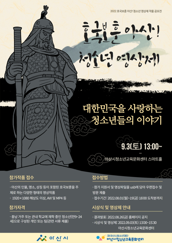 공모 대상은 충남에 거주 또는 재학 중인 만9~24세의 청소년이며, 아산의 인물‧명소‧상징 등이 포함된 호국보훈을 주제로 하는 영상작품을 접수받고 있다.