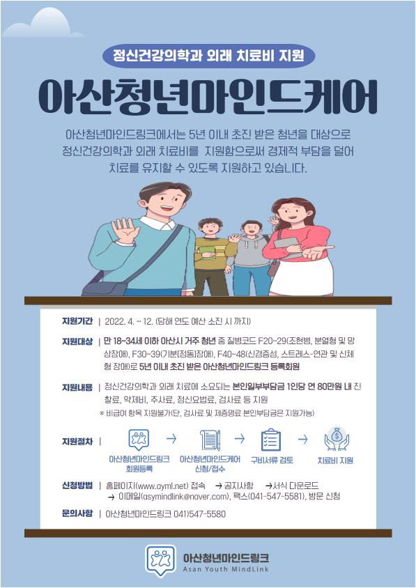 [충청뉴스 박동혁 기자] 충남 아산시는 "정신건강의학과 치료가 필요한 청년들을 위해 외래치료비를 지원하는 ‘아산청년마인드케어’ 사업에 나섰다"고 25일 밝혔다.