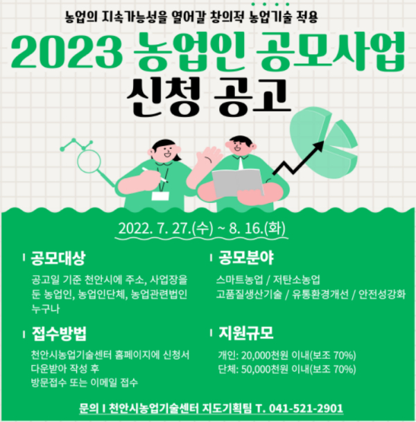 공모사업 관련 기타 자세한 사항은 천안시농업기술센터 지도기획팀으로 전화 문의하거나 농업기술센터 누리집을 참고하면 된다.