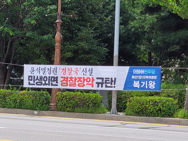 아산갑지역위는 27일 경찰국 신설에 대해 경찰의 중립성과 공정성을 심각하게 훼손하는 불법 행위로 규정하며, 아산시에 윤석열 정권의 경찰 장악 음모 저지를 위한 경찰국 신설 반대 현수막을 게시했다.