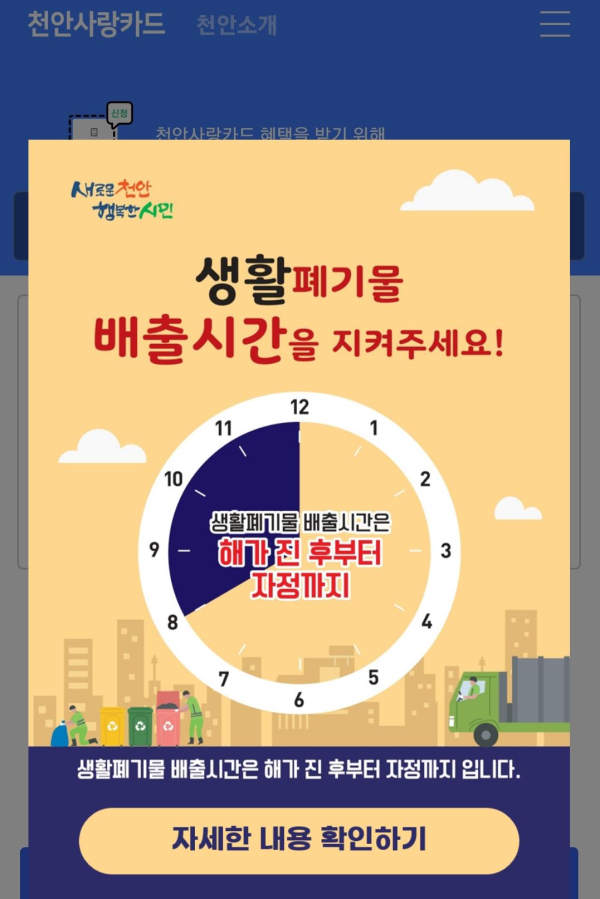 자세한 내용 확인하기를 누르면 천안시청 누리집과 연결돼 구체적인 생활폐기물 배출 방법을 알 수 있다.