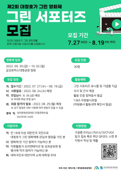 ‘그린 서포터즈’는 오는 9월 30일부터 10월 2일까지 금강로하스대청공원 일원에서 열리는 ‘제2회 대청호가 그린 영화제’의 성공적인 운영을 도와줄 자원활동가로서 영화제 현장에서 다양한 역할을 수행하게 된다.