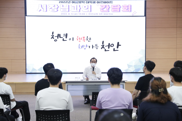 [충청뉴스 박동혁 기자] 박상돈 천안시장은 5일 시청 대회의실에서 여름방학 대학생 아르바이트 근무 학생들을 대상으로 ‘시장님과의 간담회’를 개최해 청년들의 목소리를 경청했다.