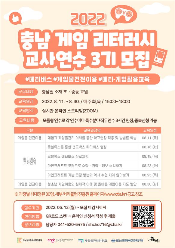 [충청뉴스 박동혁 기자] 충남정보문화산업진흥원이 운영하는 충남글로벌게임센터에서 11일부터 오는 30일까지 충남지역 초‧중등 교사를 대상으로 온라인 게임활용교육 연수를 실시한다.