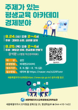 [충청뉴스 최형순 기자] 세종시교육청평생교육학습관은 ‘2022년 주제가 있는 평생교육 아카데미 경제분야 특별 강연회’를 운영한다.