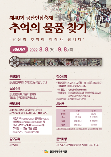 [충청뉴스 금산 = 조홍기 기자] 금산축제관광재단은 제40회 금산인삼축제를 맞아 축제의 추억을 되돌아보는 시간을 가지고자 전 국민을 대상으로 추억의 물품 찾기 공모전을 개최한다.